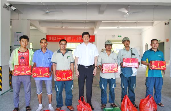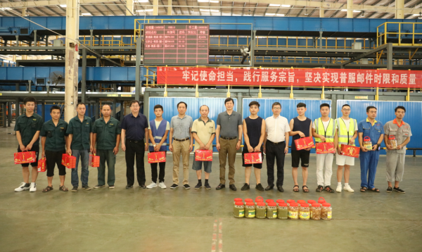 7月26日上午,張國壽一行又來到了南昌郵區(qū)中心局開展“送清涼”慰問活動,為奮戰(zhàn)在高溫一線的郵件處理中心員工送上了涼茶、冰糖、綠豆等防暑降溫食品,并囑咐員工一定要注意防暑降溫,保重身體,尤其是外勤駕駛員一定要注意勞逸結合,合理安排作息時間,保質(zhì)保量完成各項生產(chǎn)任務。