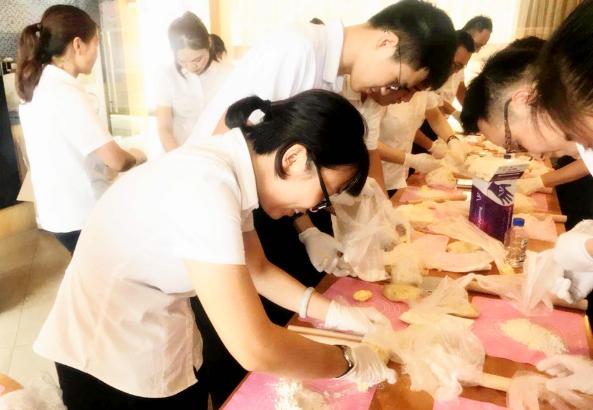 當(dāng)天下午,支行工會(huì)早早準(zhǔn)備了搟面杖、量稱(chēng)、切刀等工具和面團(tuán)、蓮蓉、豆沙、蛋黃等餡料。在專(zhuān)業(yè)面點(diǎn)師的指點(diǎn)下,支行員工紛紛動(dòng)手制作屬于自己的月餅。稱(chēng)分量、搟面皮、包月餅、刷蛋液,支行員工分工合作、相互幫助,一盤(pán)盤(pán)月餅伴隨著期待和香味出爐了。大家聊著趣事兒,其樂(lè)融融,洋溢著歡樂(lè)和幸福。