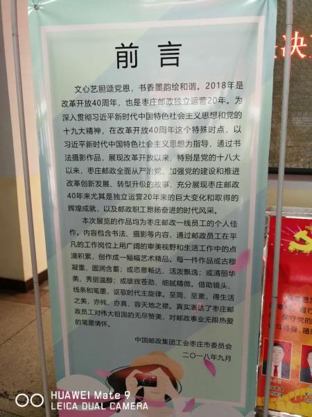 為深入貫徹習(xí)近平新時(shí)代中國(guó)特色社會(huì)主義思想和黨的十九大精神,在改革開放40周年這個(gè)特殊時(shí)點(diǎn),棗莊市分公司舉辦慶祝“改革開放40周年”暨棗莊郵政獨(dú)立運(yùn)營(yíng)20周年書法攝影作品展覽活動(dòng)。