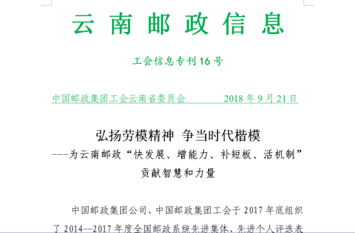 為了將這種精神化為推動云南郵政“快發(fā)展、增能力、補短板、活機制”的不竭動力,云南省郵政工會利用微信、宣傳視頻、工會信息專刊,在全省再次掀起學習先進、爭當進行的熱潮。 云南郵政全體干部職工,將以受表彰的先進集體、個人的事跡為榜樣,充分發(fā)揮先進典型的示范引領(lǐng)作用,以勞模精神團結(jié)帶領(lǐng)全省干部職工,為云南郵政發(fā)展貢獻智慧和力量。(云南郵政工會)