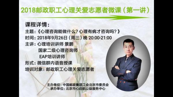 根據(jù)2018年北京郵政職工心理關(guān)愛活動(dòng)安排,北京市郵政分公司建立了一支擁有200余名職工的北京郵政心理關(guān)愛志愿者隊(duì)伍,并專門建立了“北京郵政心理關(guān)愛志愿者(微課群)”。為提高志愿者的心理專業(yè)知識(shí)和解決心理問題的能力,北京郵政工會(huì)與心啟航公司合作,將在2018年9月至2019年4月期間為心理關(guān)愛志愿者精心準(zhǔn)備6次微課。9月26日是第一講,北京郵政工會(huì)要求各基層單位的志愿者做好聽課前的準(zhǔn)備工作,力爭(zhēng)帶著問題去聆聽、去學(xué)習(xí)、去理解,以達(dá)到良好的實(shí)際效果。(北京郵政工會(huì))