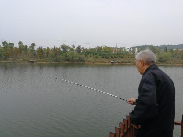 當(dāng)日9點(diǎn)左右,老同志們齊聚彩色村,他們拿上魚竿、魚餌圍塘而坐,調(diào)漂、上餌、拋竿,靜待魚兒上鉤。