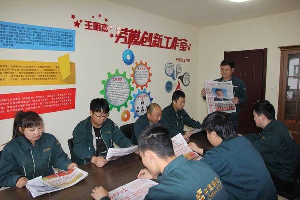 圖為王明杰(站立者)帶領(lǐng)工友一起開展班組學(xué)習(xí)活動