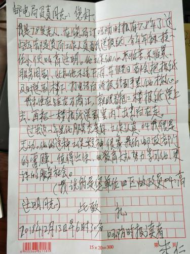 信中寫到老同志朱仁在郵政訂閱報(bào)刊已有七、八年,是《國(guó)防時(shí)報(bào)》的讀者,也是郵政忠實(shí)的老客戶。投遞員高廷明負(fù)責(zé)該老人所住片區(qū)的投遞服務(wù)工作,無論刮風(fēng)下雨、風(fēng)吹日曬、或是節(jié)假日,都能看到投遞員高廷明忙碌的身影。信中說到:投遞員每次投遞時(shí)都能親自把報(bào)刊交到老人手上,投遞員認(rèn)真負(fù)責(zé)的工作態(tài)度是我們郵政企業(yè)的雷鋒精神。老人家提出要我們學(xué)習(xí)他的精神,更好的服務(wù)社會(huì)。高廷明同志用實(shí)際行動(dòng)詮釋了“人民郵政為人民”的服務(wù)宗旨,用實(shí)際行動(dòng)踐行著郵政人的職責(zé)與使命。