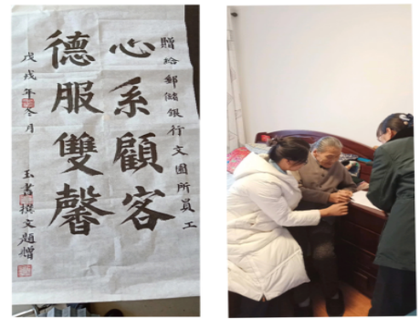 近日,一位老人將自己親筆題寫的“心系顧客 德服雙馨”交到頤和文園儲蓄所所長吳英婷手中,感激地說:“謝謝你們周到的服務(wù),幫我解決了大難題!”