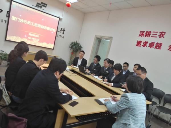 為認(rèn)真貫徹總行工會關(guān)于推進(jìn)員工思想動態(tài)調(diào)研的的工作部署,為進(jìn)一步發(fā)揮工會貼近基層、貼近員工的優(yōu)勢,真實反映廣大員工的訴求和呼聲,近日,廈門分行李芳工會主席帶領(lǐng)分行工會辦公室、工會經(jīng)審委和女工委相關(guān)人員赴同安、翔安區(qū)支行開展員工思想動態(tài)調(diào)研,深入了解員工的思想情況及日常工作情況、收集員工在日常工作中存在的困難和建議,為維護(hù)職工權(quán)益找準(zhǔn)方向,為企業(yè)科學(xué)決策提供依據(jù)。