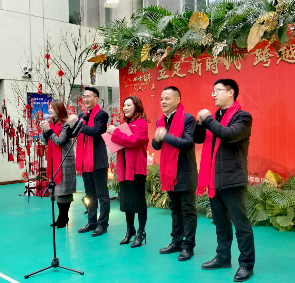 6樓的羽毛球場,經(jīng)過兩天的精心布置,在主題“立足新時(shí)代、跨越新目標(biāo)”致敬改革開放40周年的巨幅宣傳板周圍,裝點(diǎn)著鮮花和綠葉,象征著春天即將到來所迸發(fā)出的勃勃生機(jī),四周掛上了中國傳統(tǒng)文化的年畫和燈籠,兩行長桌上放上了精美的糕點(diǎn)和水果,空氣中彌漫著新春的氣息和喜悅。