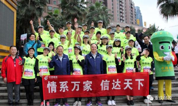 配合《馬拉松》特種郵票首發(fā),中國郵政集團公司重慶市分公司專程組織了“跑團方陣”參與“重馬”。來自部分市級部門(單位)、區(qū)縣分公司及市寄遞事業(yè)部的30名“跑馬”選手身著印有中國郵政LOGO的參賽制服,拉起“情系萬家、信達天下”的宣傳橫幅,帶上一只“郵筒”,成為賽場上一道亮麗的“綠色風景”。 早上7點,張榮林特意趕在比賽前慰問了重慶郵政參賽選手。當?shù)弥蠹襾碜圆煌瑣徫?,且大多?shù)是優(yōu)秀共產(chǎn)黨員、先進生產(chǎn)者、服務明星、“6+2”業(yè)務發(fā)展能手等時,張榮林豎起大拇指為他們點贊。