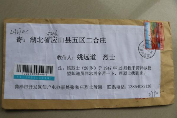 2月22日,一封來自山東菏澤市張和莊烈士陵園、收信人為姚遠(yuǎn)道烈士的掛號(hào)信,幾經(jīng)輾轉(zhuǎn)來到廣水投遞站市投五段投遞員沈?qū)殫澋氖稚?,“該烈士?8歲)于1947年12月犧牲于菏澤戰(zhàn)役,望郵遞員同志再辛苦一下,幫烈士找到家。”信封上的這樣一句話讓沈?qū)殫澅陡袎毫?。時(shí)隔72年,收信地址“湖北省應(yīng)山縣五區(qū)二合莊”隨著行政區(qū)劃的調(diào)整早已更名,收信人個(gè)人信息亦無法在戶籍系統(tǒng)中查詢,留給沈?qū)殫澋木€索太少了。“姚遠(yuǎn)道是位烈士,是為了解放新中國而犧牲的,無論如何我們郵政要幫他找到家!”抱著這樣的念頭,這位全省勞模再一次踏上了這條既熟悉又陌生的“死信復(fù)活路”。