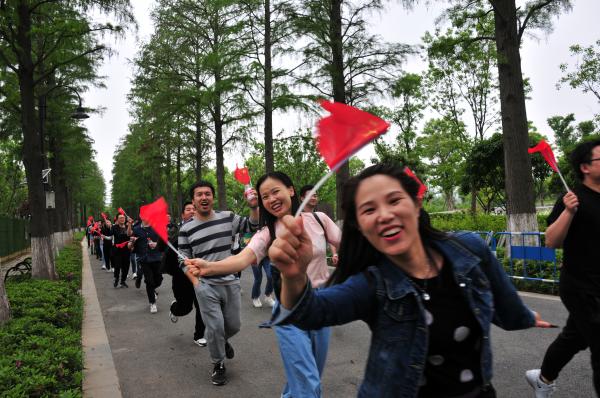 參觀學習結束后,在四面鮮紅旗幟的帶領下,大家集體前往東湖綠道開展了“健步走”活動?;顒又校蠹曳譃閮申?,有序前行。6公里的行進路程,大家時而口號聲聲、時而紅歌嘹亮、時而小憩留影、時而瘋狂暴走,在湖邊綠道上形成了一道靚麗的風景線,引得路人頻頻觀望、駐足拍照,湖北郵政青年員工朝氣蓬勃、積極向上的青春風貌一展無遺。