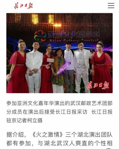 郵政藝術團的優(yōu)秀表現受到了省內各大媒體的關注和爭相報道。團長龔焰在接受《長江日報》記者采訪時說:“《火之激情》節(jié)目因需要與外國藝術家同臺,音樂合成難度很大。有些國外藝術團隊前期排練的音樂與嘉年華演出的音樂有差別,必須重新錄音合成,這個節(jié)目與多個外國演出團隊合作,每來一個國家我們都要重新合成一次音樂,工作量是加倍的,對演員來說很具有挑戰(zhàn)性?!?/p>