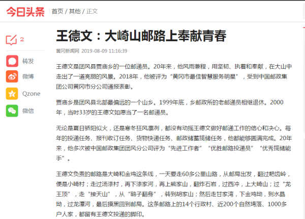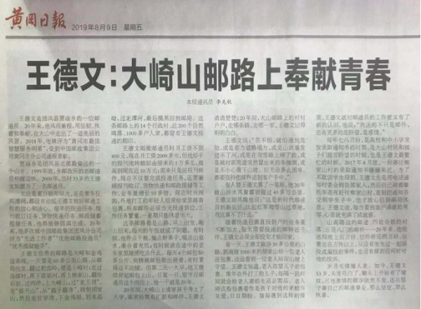 8月9日,《黃岡日報》、黃岡新聞網(wǎng)分別以《王德文:大崎山郵路上奉獻青春》為題,報道了團風(fēng)縣賈廟郵政支局投遞員王德文的先進事跡,引起了社會廣泛關(guān)注。