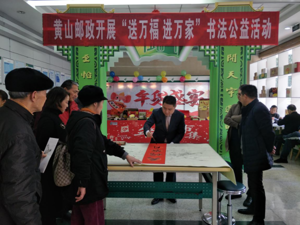 1月5日上午,黃山市郵政工會(huì)在市分公司前園郵政南路郵政營業(yè)大廳組織開展了“送萬福 進(jìn)萬家”書法公益活動(dòng),義務(wù)為員工書春送福,受到廣大員工歡迎和贊譽(yù)。