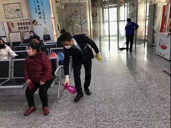 圖為胡吉?jiǎng)偡艞壭菹r(shí)間,義務(wù)幫助支局網(wǎng)點(diǎn)開(kāi)展服務(wù)引導(dǎo)與消殺工作