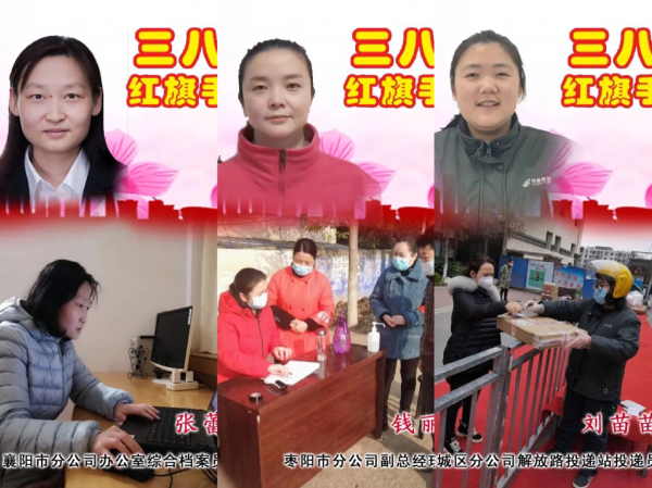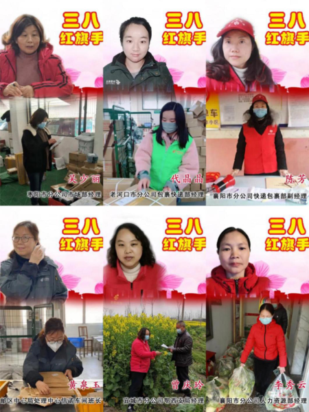 2020年3月8日,第110個“三八”國際勞動婦女節(jié)到來之際,襄陽市郵政分公司決定授予宜城分公司鄂西支局經(jīng)理曾慶玲、老河口分公司包裹快遞部經(jīng)理代晶晶、谷城分公司綜合辦公室經(jīng)理 蔣艷芳、??捣止揪C合辦公室辦事員王先奎、棗陽分公司市場部經(jīng)理吳少麗、棗陽分公司副總經(jīng)理錢麗、南漳分公司綜合辦公室辦事員嚴霜、襄州分公司市場部經(jīng)理向倩、樊城分公司襄城投遞站投遞員 陳秀琴、樊城分公司解放路投遞站投遞員劉苗苗、襄城分公司臥龍支局投遞員朱玉敏、郵區(qū)中心局處理中心信函車間班長黃泉玉、市分公司快遞包裹部副經(jīng)理陳芳、市分公司人教部經(jīng)理李秀云、市分公司綜合辦公室秘書張蕾15名同志“三八紅旗手”榮譽稱號。