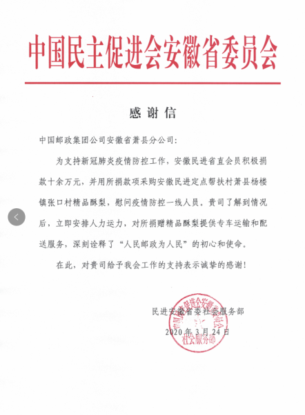 3月24日,中國民主促進(jìn)會安徽省委員會給蕭縣分公司發(fā)來一封感謝信,感謝郵政對所捐贈精品酥梨提供專車運(yùn)輸和配送服務(wù)。