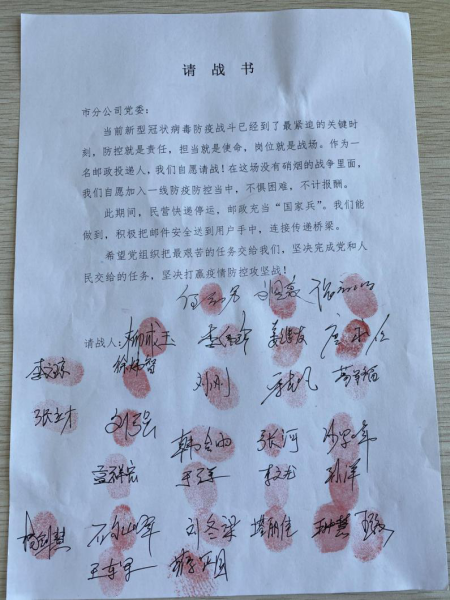 同事的“老師傅”。隨著疫情的嚴(yán)峻,投遞郵件的難度不斷加大。為提高投送效率和做好投遞員防控,每天班前會上,柳成玉都要傳達(dá)市委、市政府、市郵政分公司的各項(xiàng)工作部署要求,檢查投遞員防護(hù)情況,講解防控知識,以及應(yīng)急方案等。并不停地給兄弟們加油打氣,發(fā)紅包鼓勵(lì),傳遞正能量。他主動請纓,帶領(lǐng)33名投遞員在請戰(zhàn)書上簽上自己的名字,按上紅手印,承諾初心不改,招之即戰(zhàn),將義無反顧地沖在一線,確保完成各項(xiàng)工作任務(wù)。