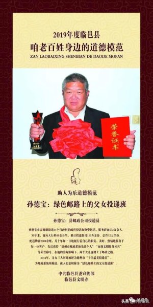 近日,投遞員孫德寶于德州市臨邑縣宣傳部組織開(kāi)展的評(píng)選活動(dòng)中,經(jīng)由社會(huì)評(píng)選,被評(píng)為2019年度臨邑縣“咱老百姓身邊的道德模范”。