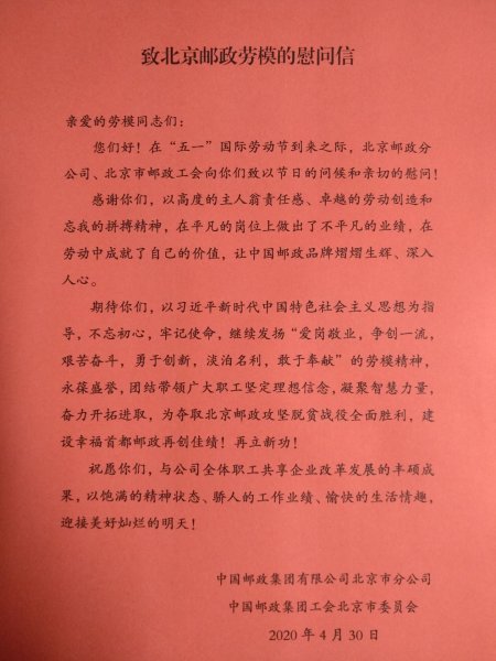 勞動(dòng)最光榮,勞動(dòng)最崇高,勞動(dòng)最偉大,勞動(dòng)最美麗?!拔逡弧眹?guó)際勞動(dòng)節(jié)到來(lái)之際,北京郵政分公司、北京市郵政工會(huì)以《致北京郵政勞模的慰問(wèn)信》和精心準(zhǔn)備的慰問(wèn)品,向公司全體在職勞模致以節(jié)日的問(wèn)候和親切的慰問(wèn),感謝勞模同志們以高度的主人翁責(zé)任感、卓越的勞動(dòng)創(chuàng)造和忘我的拼搏精神,在平凡的崗位上做出了不平凡的業(yè)績(jī),同時(shí)勉勵(lì)勞模同志們要不忘初心,牢記使命,繼續(xù)發(fā)揚(yáng)“愛(ài)崗敬業(yè),爭(zhēng)創(chuàng)一流,艱苦奮斗,勇于創(chuàng)新,淡泊名利,敢于奉獻(xiàn)”的勞模精神,團(tuán)結(jié)帶領(lǐng)廣大職工為奪取北京郵政攻堅(jiān)脫貧戰(zhàn)役全面勝利,建設(shè)幸福首都郵政再創(chuàng)佳績(jī),再立新功。并祝愿大家以飽滿的精神狀態(tài)、驕人的工作業(yè)績(jī)、愉快的生活情趣,迎接美好燦爛的明天。