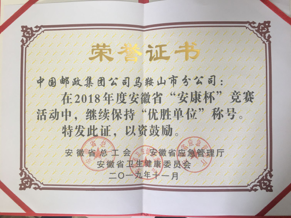 4月20日下午,市總工會(huì)召開(kāi)全市工會(huì)十二屆十二次全體(擴(kuò)大)會(huì)議,會(huì)上馬鞍山市郵政市分公司受到表彰,榮獲“2018年度安徽省安康杯競(jìng)賽優(yōu)勝單位”稱(chēng)號(hào)。 安徽省“安康杯”競(jìng)賽是在省委、省政府的堅(jiān)強(qiáng)領(lǐng)導(dǎo)下,按照中華全國(guó)總工會(huì)和國(guó)家安全生產(chǎn)監(jiān)督管理總局的統(tǒng)一部署,全省企事業(yè)單位積極參與,以“廣泛發(fā)動(dòng)提質(zhì)量,文化引領(lǐng)強(qiáng)基礎(chǔ)”為主題的“安康杯”競(jìng)賽活動(dòng),是安全生產(chǎn)最高榮譽(yù)獎(jiǎng)牌。