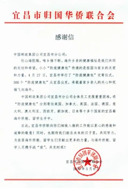 “宜昌市僑聯(lián)向你們細致入微的工作致以衷心的感謝和誠摯的敬意!”5月6日,宜昌市郵政分公司收到了一封來自宜昌市歸國華僑聯(lián)合會的感謝信。信中對宜昌分公司全體員工克服重重困難,將防疫物資寄給美國、加拿大等十多個國家的宜昌籍海外僑胞、留學生表示感謝。