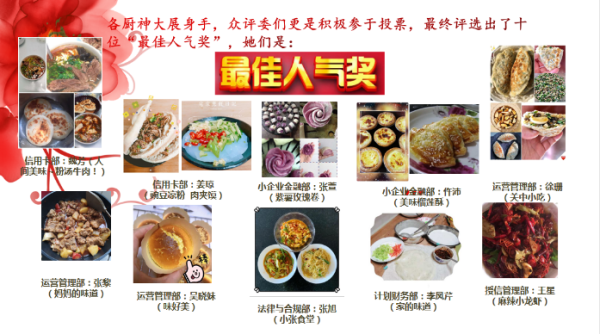 為了體現(xiàn)對女職工的關(guān)愛,在疫情防控的特殊時期,渭南市、銅川市分行機關(guān)工會分別組織了慶“三八”廚藝大比拼線上評選活動。渭南市分行28名選手踴躍報名參加了本次活動,上傳了各色菜系,有以辣為主的川菜系,有以面食為主的陜菜系,還有各種甜品、小吃、花式拼盤等,拼湊出一桌渭南郵儲的“滿漢全席”;銅川市分行共收到50部美食制作圖片,餃子、糕點、燒烤、火鍋等菜品琳瑯滿目,通過線上集贊、評選,評出“最美”廚娘,度過了一個充實快樂的節(jié)日。