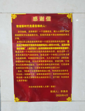 原來,2018年的一天黃昏,一位保定的客戶來到解放中路營業(yè)所,想辦理轉帳業(yè)務。但因為已經下班,柜臺無法再為客戶辦理業(yè)務。理財經理就帶著客戶到廳外的自助柜員機上辦理。等客戶走后,理財經理想去自動柜員機防護倉里打掃衛(wèi)生,恰巧看到機器臺面上放著200元鈔票,理財經理馬上意識到這一定是剛才轉帳的客戶落下的,于是馬上去追,但人已經找不到了。隨后,營業(yè)所工作人員通過賬戶信息,費了一番周折后,才聯系到了客戶并將錢轉給了客戶。近日,這位客戶因到滄州處理業(yè)務,專程來到了解放中路營業(yè)所,送給了營業(yè)員一張?zhí)貏e制作的大幅感謝信,并專門為此事制作了一個小視頻為營業(yè)員們播放,以表達自己心中的感激之情。