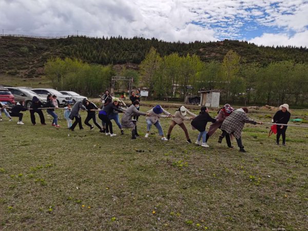 小憩時,有爬山看花的,有去看牦牛的,有的在釣魚,到處是一片祥和的景象。接下來是集中活動,同時也是大伙展示才藝的時候。首先進行了跳繩比賽,其次是拔河比賽,拔河比賽按年齡、按喜好等分成兩組進行,輸的組出一個節(jié)目,雖然輸了但仍獲得笑聲一片。最后是傳花接鼓,大伙圍成一圈順序傳遞花球,一人背著大家進行擊鼓,在鼓聲停止時花球落到誰,就由誰來表演節(jié)目。有的唱流行歌曲、有的唱藏歌、有的唱兒歌、有的表演自己的小才藝,歡聲笑語飄蕩在藍天白云間,活躍的氣氛,不時引來旅客的圍觀。欣賞自然,放飛心情,工會組織讓廣大員工度過了舒心、愉快、安全的一天。