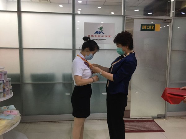 圖為吉林市總工會副主席劉紅衛(wèi)親自為梁春慧佩戴上勞動獎?wù)?/p>