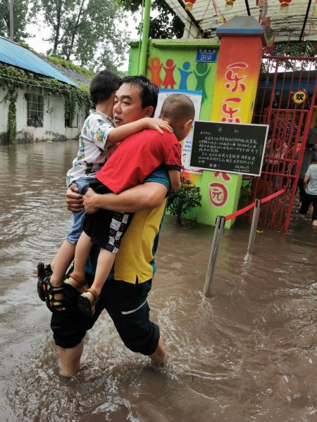 見此情況,王維立即安排2名員工留守網(wǎng)點繼續(xù)營業(yè),其余5人前往幼兒園幫助老師們一起將困在園中的孩子們轉(zhuǎn)移到郵政網(wǎng)點大廳。郵亭郵政所的員工們脫掉鞋子、挽起褲腳,便沖進了雨中,他們有的將孩子背在背上,有的將兩個孩子抱在懷里,流水線作業(yè),默契配合,一部分人將孩子們從教室轉(zhuǎn)移到操場的舞臺,一部分人將孩子們從舞臺轉(zhuǎn)移到網(wǎng)點大廳。歷時半小時,60余名小朋友成功被轉(zhuǎn)移至安全地點。