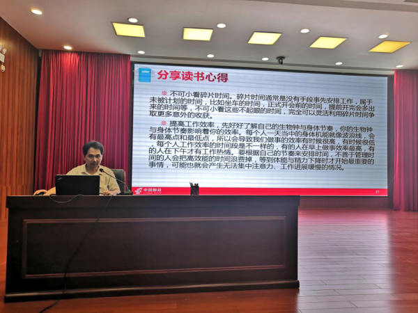 講座現(xiàn)場,市公司服務(wù)質(zhì)量部李翰平副經(jīng)理還與員工分享了一本題為《職場第一課.時(shí)間管理》的好書,講述了面對繁雜的工作,怎樣管理時(shí)間才能更從容?如何有效利用業(yè)余時(shí)間,讓自已獲得更多新技能?讓每一位在場的員工明白了怎樣合理分配時(shí)間提高自已做事的專注力,進(jìn)行高質(zhì)量的工作以及如何靈活利用碎片時(shí)間爭取更多意外的收獲。