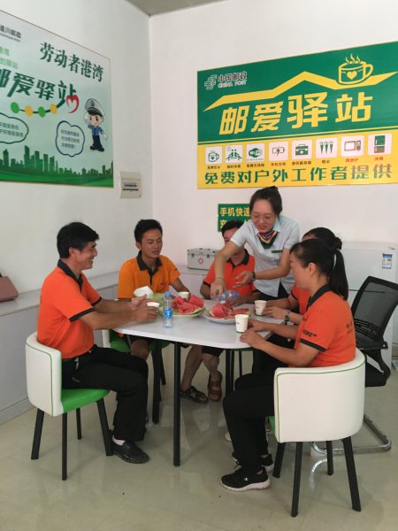 “郵愛驛站”指設(shè)立在郵政城市網(wǎng)點(diǎn)向客戶及環(huán)衛(wèi)工人、交警(協(xié)管員)、快遞員、出租司機(jī)等戶外勞動者及殘障人士提供桌椅、飲水機(jī)、充電器、應(yīng)急外敷藥品等設(shè)施和服務(wù)的場所。