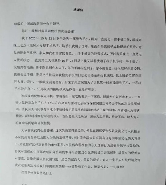 第一封信來自用戶溫顏紅女士,這封感謝信背后有一個拾金不昧、助人為樂的故事。溫顏紅女士于10月22日不慎將手機丟失后,內(nèi)心十分焦急,因為手機里存儲著記錄孩子成長的照片,這些照片對她來說十分重要。由于手機被設(shè)置為靜音模式,當天晚上溫女士一直無法撥通,直到第二天晚上才有人接聽?!敖K于聯(lián)系到您了,手機我揀到了,不要著急,我很理解您的心情,我們約在您丟手機的日壇公園見面吧?!睊鞌嚯娫?,溫女士覺得一股暖流涌遍全身。 后來,溫女士得知是朝陽區(qū)呼家樓郵政支局的員工倪松明拾金不昧,便想請他吃飯。但為了不影響工作,倪松明婉言謝絕了她的邀請。因此,溫女士最終選擇用一封信表達對倪松明的感謝。她在感謝信中說:“這次失而復得的經(jīng)歷,使我真切感受到了郵政企業(yè)員工拾金不昧的高尚品格、助人為樂的雷鋒精神。在此,再一次向?qū)Τ栢]政培養(yǎng)出的優(yōu)秀的員工表示感謝?!?/p>