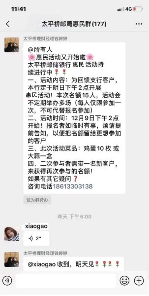 據(jù)了解,參與“便民服務(wù)商圈”金融客戶惠民體驗(yàn)活動(dòng)(以下簡(jiǎn)稱活動(dòng))的百姓,能以低于市場(chǎng)均價(jià)的方式購(gòu)買到“郵商聯(lián)盟”商戶(支行長(zhǎng)期合作果蔬商)提供的時(shí)令果蔬,果蔬種類逢周更新,涉及西紅柿、香菇、油菜、大蒜、老玉米、扁豆等二十多種常見(jiàn)生活必需品。 活動(dòng)前夕,客戶可通過(guò)支行客戶微信群發(fā)起的活動(dòng)邀約信息,集中進(jìn)行線上接龍式報(bào)名;“接龍報(bào)名”一方面便于支行工作人員高效采集活動(dòng)參與人員信息,另一方面也是提高群成員互動(dòng)、營(yíng)造良好群營(yíng)銷氛圍的好方法。活動(dòng)規(guī)定每名金融客戶常規(guī)僅可參與一次優(yōu)惠,若老客戶邀請(qǐng)新客戶入群,可二次參加優(yōu)惠活動(dòng)。在活動(dòng)現(xiàn)場(chǎng),支行理財(cái)經(jīng)理穿插為客戶講解了資產(chǎn)配置、新版人民幣真?zhèn)舞b別技巧等內(nèi)容,并宣講了2021年代理金融“開(kāi)門紅”即將推出的金融產(chǎn)品。