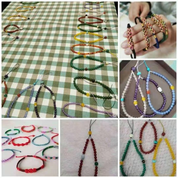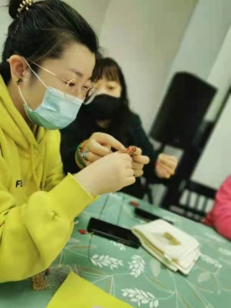 結(jié)繩看似簡(jiǎn)單,其實(shí)每一個(gè)步驟都很關(guān)鍵,錯(cuò)了一步就會(huì)失敗,幾個(gè)看似簡(jiǎn)單的動(dòng)作卻能編織出不同的繩結(jié),在老師不厭其煩的指導(dǎo)下,大家反復(fù)摸索,手法逐漸嫻熟起來(lái)!神奇的繩藝加上裝飾品的搭配,顯示出濃濃的中國(guó)風(fēng)以它獨(dú)特的魅力征服了大家!難得的手工DIY機(jī)會(huì)讓大家樂(lè)在其中。“看我的珠鏈完工啦”“我的七彩手串也好了”聲音此起彼伏,女神們迫不及待迫不及待向在場(chǎng)的人展示自己的手工作品。