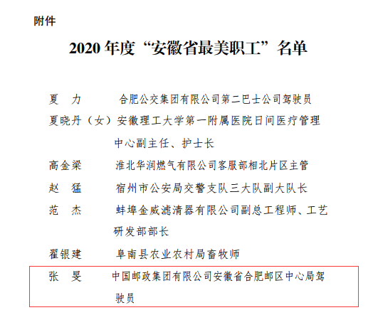 近日,安徽省委宣傳部、安徽省總工會(huì)聯(lián)合下文,合肥郵區(qū)中心局郵件運(yùn)輸中心張旻同志榮獲“2020 年度安徽省“最美職工” 稱號(hào)。