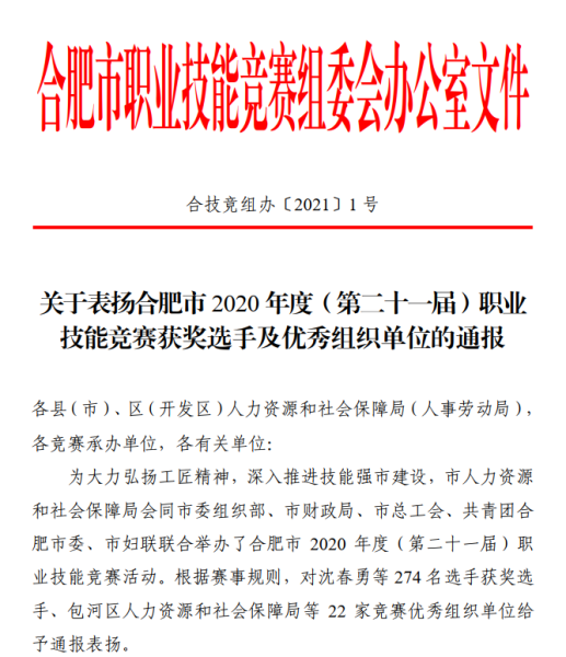 近日,從合肥市職業(yè)技能競賽組委會辦公室獲悉,合肥郵區(qū)中心局蟬聯(lián)合肥市 2020年度(第二十一屆)職業(yè)技能競賽優(yōu)秀組織單位。孔志銘等6名同志榮獲“合肥市技術(shù)能手”榮譽稱號。該局連續(xù)十二年承辦合肥市業(yè)務(wù)技能競賽,連續(xù)十二年被評為優(yōu)秀組織單位,涌現(xiàn)一批集團、省級業(yè)務(wù)技術(shù)能手及上百名市級術(shù)能手和金牌職工。
