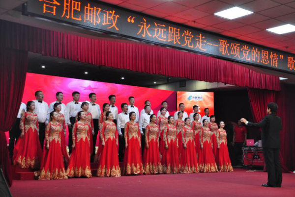市分公司黨委班子全體成員、15支參賽隊(duì)伍,近400名職工參賽,用歌聲抒發(fā)對(duì)黨和國家的熱愛之情,堅(jiān)定永遠(yuǎn)跟黨走的決心,共同慶祝中國共產(chǎn)黨百年華誕。 比賽中,整齊統(tǒng)一的特色著裝、豐富多樣的藝術(shù)形式、昂揚(yáng)向上的精神風(fēng)貌,各代表隊(duì)在舞臺(tái)上顯身手、展風(fēng)采,激情澎湃、豪情滿懷地唱響《不忘初心》《相遇百年》《在燦爛陽光下》《我和我的祖國》《沒有共產(chǎn)黨就沒有新中國》《保衛(wèi)黃河》《歌唱祖國》等一曲曲經(jīng)典紅歌,用歌聲回顧黨的百年偉業(yè),用真情歌頌黨的光輝歷程,用真摯的情感唱出對(duì)黨和祖國的熱愛與崇敬。 一首首膾炙人口的紅歌唱響了時(shí)代主旋律,一聲聲情真意切的祝福唱出了合肥郵政人紅心向黨、胸懷祖國的質(zhì)樸情感。經(jīng)過比拼,城區(qū)寄遞快包部聯(lián)合代表隊(duì)獲得一等獎(jiǎng);機(jī)關(guān)聯(lián)合代表隊(duì)和肥西縣分公司代表隊(duì)分獲二等獎(jiǎng);巢湖市分公司代表隊(duì)與市場(chǎng)營銷部代表隊(duì)及文傳金融渠道聯(lián)合代表隊(duì)分獲三等獎(jiǎng),其他參賽隊(duì)分獲優(yōu)勝獎(jiǎng)。