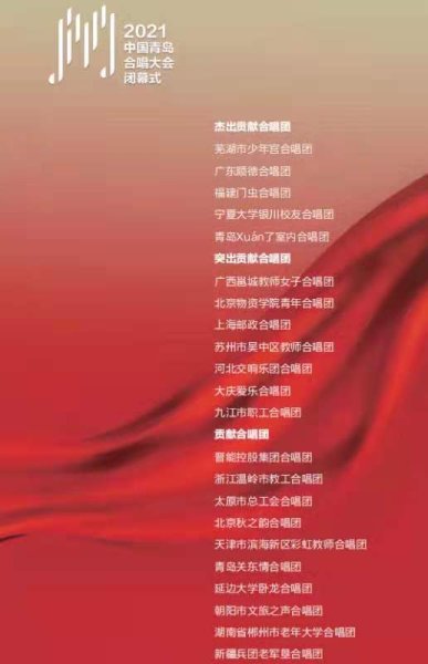 2021年7月23日-27日,2021年中國青島合唱大會(huì)在青島即墨音樂廳舉行。本次大會(huì)由中國音樂家協(xié)會(huì)、中共青島市委宣傳部指導(dǎo),由中國音樂家協(xié)會(huì)合唱聯(lián)盟、山東省音樂家協(xié)會(huì)、青島市文化和旅游局、青島市即墨區(qū)人民政府主辦,以慶祝建黨100周年為主題。