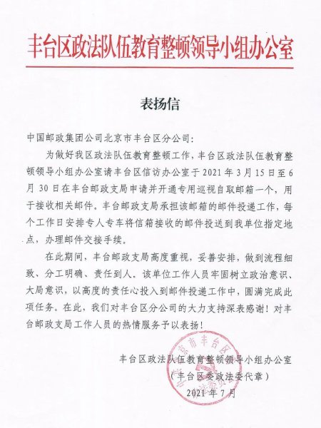 表揚(yáng)信中指出,為做好豐臺區(qū)政法隊(duì)伍教育整頓工作,豐臺區(qū)政法隊(duì)伍教育整頓領(lǐng)導(dǎo)小組辦公室請豐臺區(qū)信訪辦公室于2021年3月15日至6月30日,在豐臺郵政支局申請開通專用巡視信箱一個,用于接收相關(guān)郵件。豐臺郵政支局承擔(dān)該郵箱的郵件投遞工作,每個工作日安排專人、專車將信箱接收的郵件投送至我單位指定地點(diǎn),并辦好相關(guān)郵件交接手續(xù)。在此期間,豐臺郵政支局妥善安排該項(xiàng)工作,做到流程細(xì)致、分工明確、責(zé)任到人;相關(guān)服務(wù)人員牢固樹立政治意識、大局意識,以高度的責(zé)任感投入到郵件投遞工作中,最終圓滿完成了此項(xiàng)任務(wù)。在此,我們對豐臺區(qū)郵政分公司及所屬豐臺郵政支局的大力支持深表感謝!對豐臺郵政支局相關(guān)工作人員的熱情服務(wù)予以表揚(yáng)!