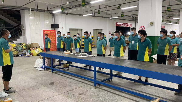8月28日9點(diǎn)40分,忙碌了一天,揚(yáng)州郵政城區(qū)寄遞事業(yè)部西區(qū)的郵件分揀場地漸漸安靜下來。與以往大家三三兩天忙著準(zhǔn)備休息不同,今天大家主動在場地中間集中,排排站好,保持著一米線距離。隊(duì)伍面前的皮帶機(jī)還殘留余熱,上面擺放著兩盒生日蛋糕。