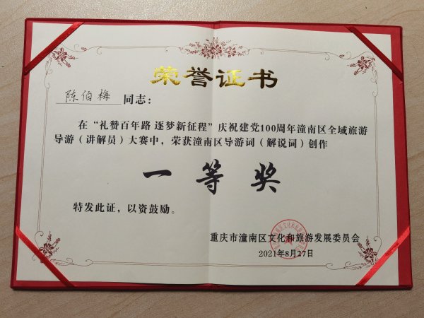 2021年8月27日,潼南區(qū)文化和旅游發(fā)展委員會舉辦的“禮贊百年路 逐夢新征程”慶祝建黨100周年潼南區(qū)全域旅游導(dǎo)游(講解員)大賽勝利落下帷幕,潼南分公司四方郵政所負責(zé)人陳伯梅獲評潼南區(qū)導(dǎo)游詞(解說詞)創(chuàng)作一等獎。