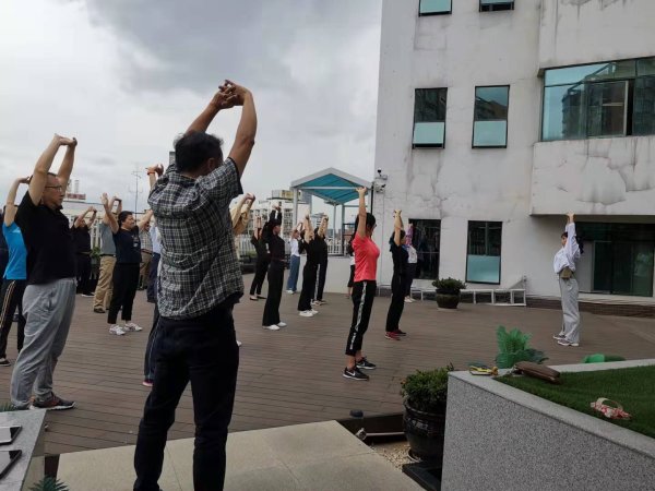 在社會快速發(fā)展,各種壓力日益加大的現(xiàn)實(shí)情況下,關(guān)心職工身心狀態(tài)不斷提高職工健康管理意識和健康水平顯得越發(fā)重要。學(xué)習(xí)簡便易行、不受環(huán)境、場地限制的一些科學(xué)健身方法,能有效幫助職工增強(qiáng)參與運(yùn)動的興趣和信心,從中獲得持續(xù)運(yùn)動的健康收效。在職工的熱心幫助和推薦下,機(jī)關(guān)工會組織開展了職工健身八段錦的練習(xí),練習(xí)活動安排在下午下班后,大家結(jié)束一天忙碌的工作,相約來到四樓平臺,在傍晚的微風(fēng)中,跟隨老師舒張肢體放松身心,在練習(xí)中體會著傳統(tǒng)健身方式帶給自己身體的調(diào)適,一天緊張工作的疲憊感,在肢體的拉伸中漸漸被消散。