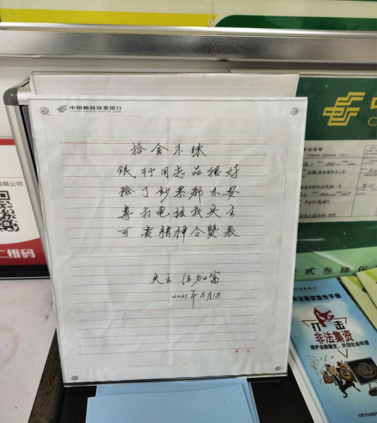 一個小時后,終于發(fā)現(xiàn)原來是官港鎮(zhèn)民主村70多歲的村民汪加福在ATM機自助取款時不小心遺失的,在確認(rèn)失主后,胡局長多方打聽,終于和汪加福老人取得了聯(lián)系,通知老人第二天到營業(yè)大廳領(lǐng)取失款。 第二天,汪加福老人來到官港郵政支局,和胡局長說,你們郵政員工的品德太高尚了,這讓他非常感動,為了表達(dá)謝意,他當(dāng)天晚上醞釀半宿,寫了一首打油詩送給胡局長,贊揚郵政員工風(fēng)格高品德好,更是贊嘆百年郵政確實值得百姓信賴,回去一定要好好宣傳郵政,今后有錢都到郵政存。