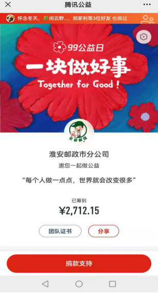 “99公益日”是由騰訊公益聯(lián)合數(shù)百家公益組織、企業(yè)共同發(fā)起的一年一度全民公益活動(dòng)。2020年,由淮安市郵政分公司、淮安郵政工會(huì)發(fā)起的“關(guān)愛(ài)郵包”計(jì)劃經(jīng)市慈善總會(huì)推薦,正式上線騰訊公益“99公益日”活動(dòng)。