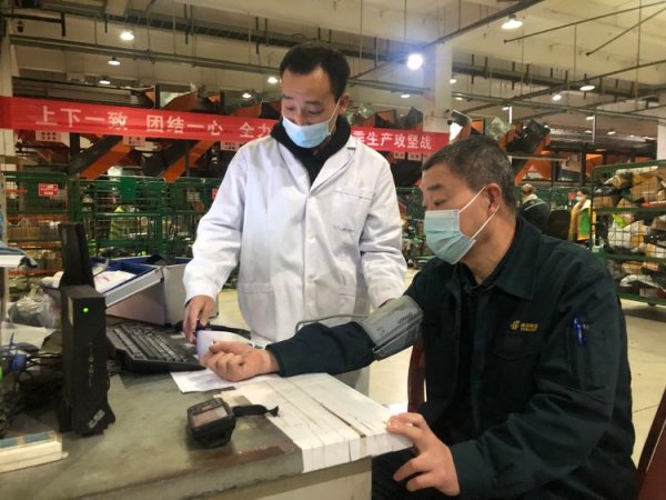 醫(yī)生在了解郵區(qū)中心職工情況和作業(yè)特點(diǎn)后,針對性地制定“雙11”期間職工健康注意事項(xiàng),備齊各種急救藥品。除坐診外,同時(shí)安排專班車間巡場,為現(xiàn)場生產(chǎn)人員量血壓,傳授急救知識等,保障全體職工過安全“雙11”、溫暖“雙11”!