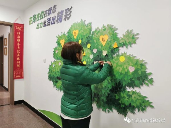 職工小家四周特別設(shè)計(jì)了員工“心愿樹”、職工文化墻; 豐臺(tái)區(qū)方莊郵政支局副局長(zhǎng)、部門工會(huì)主席王麗萍介紹道:“臨近春節(jié),很多員工都在‘心愿樹’上寫下了新年愿望,你們看現(xiàn)在這棵樹越來越‘枝繁葉茂’了!同時(shí),我們把員工日常開發(fā)的業(yè)務(wù)產(chǎn)品、職工藝術(shù)作品添加到了職工文化墻上,將大家的智慧成果集中展示在小家這塊新天地里,也是我們這次建家的特別用意。”