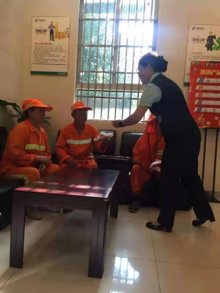 在驛站內(nèi),桌椅、手機充電線、應(yīng)急藥箱、微波爐、飲水機、冰箱、空調(diào)、無線網(wǎng)等一應(yīng)俱全,戶外工作者如受小傷,可到這里擦擦酒精,做些簡單的處理。天冷時,大家能過來用微波爐加熱飯菜。天熱時,可入內(nèi)歇歇腳,今年夏天氣溫最高的時候,網(wǎng)點還煮了綠豆湯,供周邊的戶外工人休息時喝,得到了附近環(huán)衛(wèi)工人的一致好評。