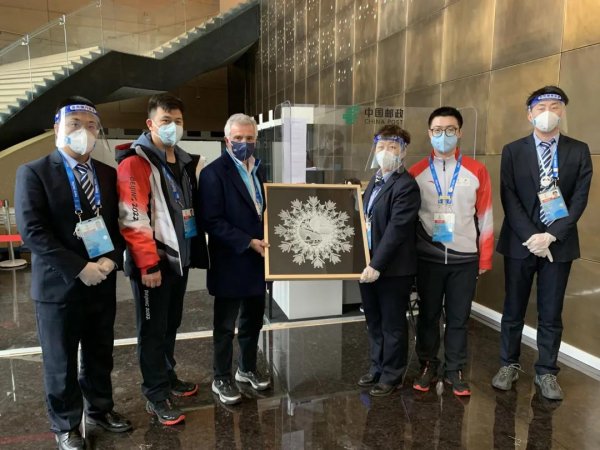 國(guó)際奧委會(huì)副主席胡安·安東尼奧·小薩馬蘭奇先生從北辰洲際酒店臨時(shí)郵局順利寄出包裹后,對(duì)郵政服務(wù)十分滿意,他親自來(lái)到網(wǎng)點(diǎn)向工作人員致謝,并送上“大美冬奧”主題剪紙藝術(shù)品。(北京郵政工會(huì))
