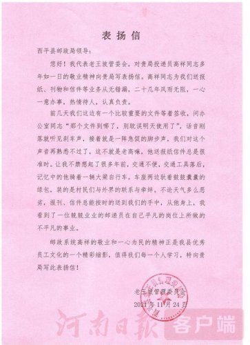老王坡管委會苗海民部長動情的說:“高祥在我們這服務了30多年了,從上班就在這,這么多年來,為我們送報紙、刊物和信件等從無錯漏,多少年風雨無阻,一心一意辦事,無論是大街小巷、街坊老少沒有一個人不認識他的。前幾天我們這邊有一個比較重要的文件等著簽收,問辦公室通知文件到哪,別耽誤用了,話音剛落老高就準時過來了,他送報紙信件總是很準時?!鞭k公室劉琳主任也說:“高祥人勤快,前些年交通工具落后,一輛大梁自行車跑了多少路,不論刮風下雨、嚴寒酷暑從沒漏過一份報紙,少過一個郵件,從他身上,我看到了一位兢兢業(yè)業(yè)的郵遞員在自己平凡崗位上所做的不平凡的事業(yè)”。